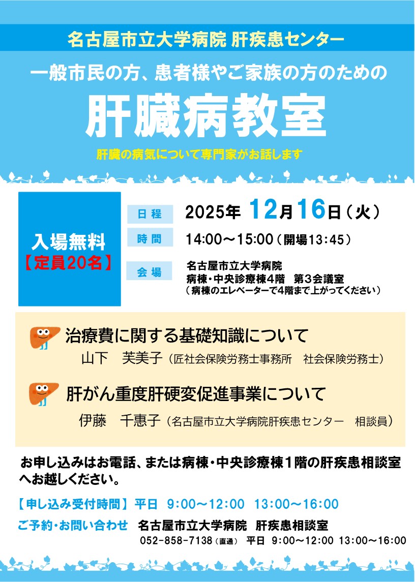 | 場所 | 名古屋市立大学病院 病棟・中央診療棟1階 肝疾患相談室 |
