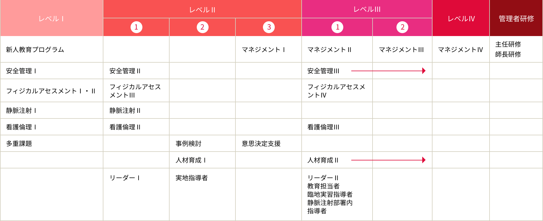 キャリアラダーを指標にキャリア構築。クリニカルラダー、マネジメントラダーのレベルに応じたさまざまな研修を実施しています。