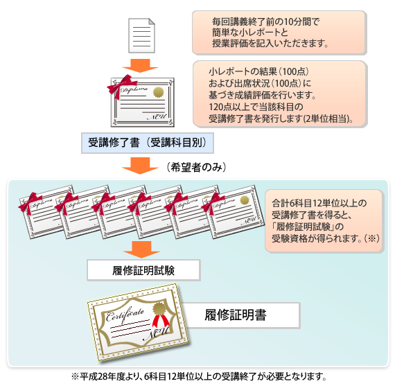 合計6科目12単位以上の受講修了書を得ると、「履修証明試験」の受験資格が得られます。6科目以上受講修了し、かつ、「履修証明試験」に合格した者には履修証明書を授与します。